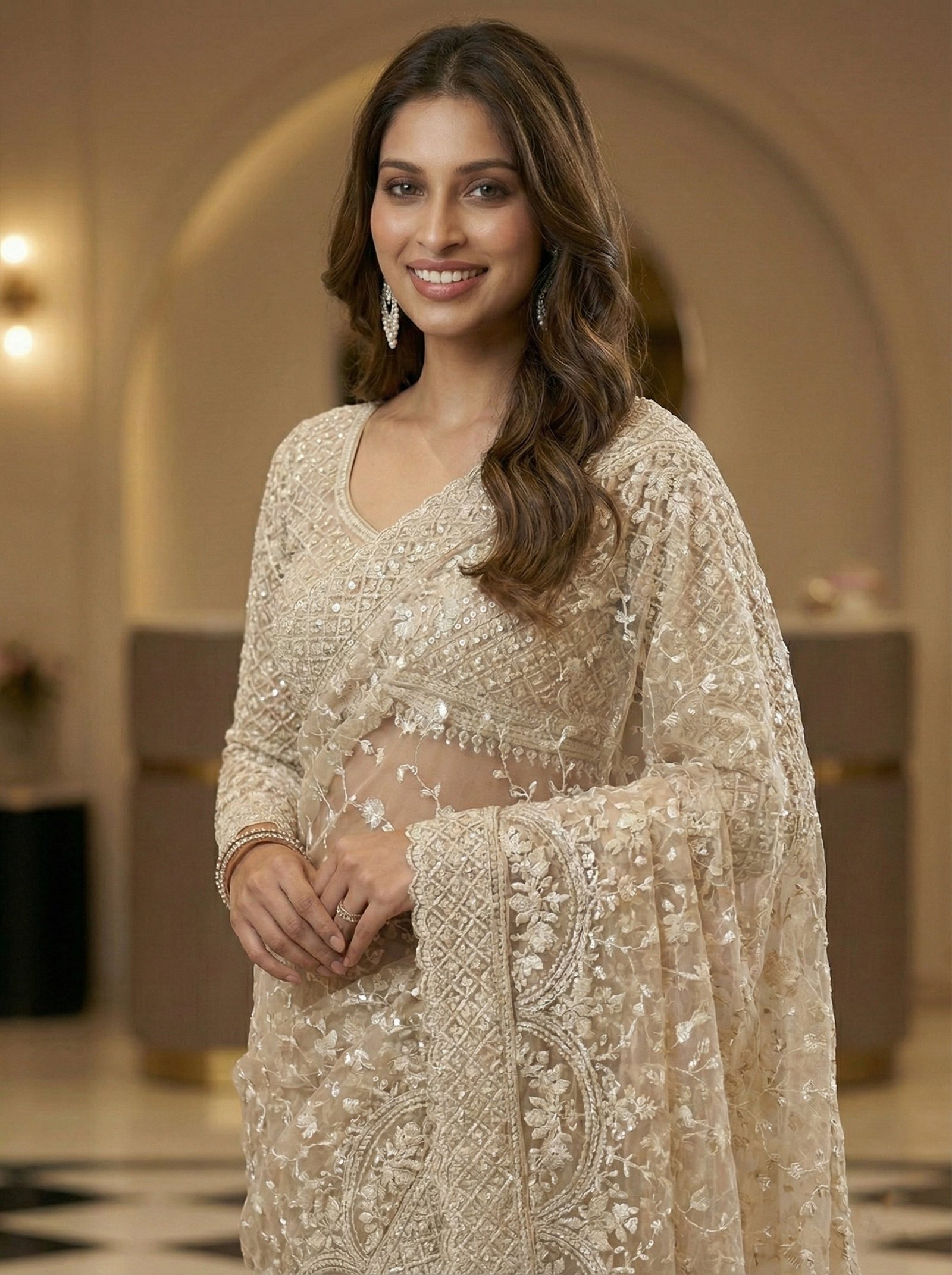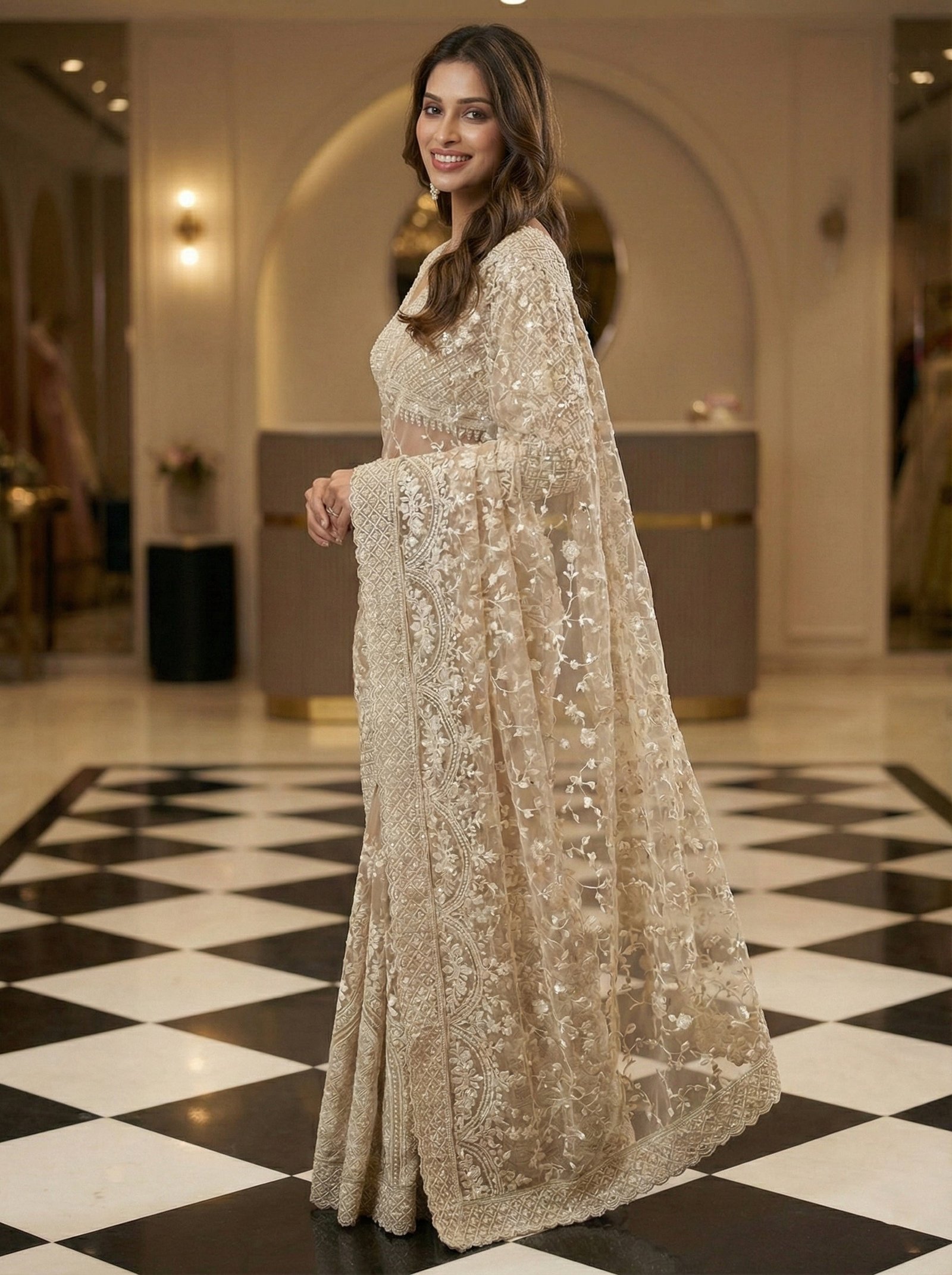 Elevate your ethnic wardrobe with this stunning cream net saree, meticulously crafted with heavy hand embroidery that showcases traditional artistry. The delicate net fabric drapes gracefully while the intricate embroidered detailing adds timeless elegance and sophistication. Perfect for weddings, festivals, and special occasions, this saree combines classic beauty with exquisite craftsmanship. The cream hue offers versatility, complementing various skin tones and allowing you to style it with traditional jewelry and accessories. Invest in a piece that celebrates heritage and refined taste—a saree that transforms any celebration into a memorable moment.