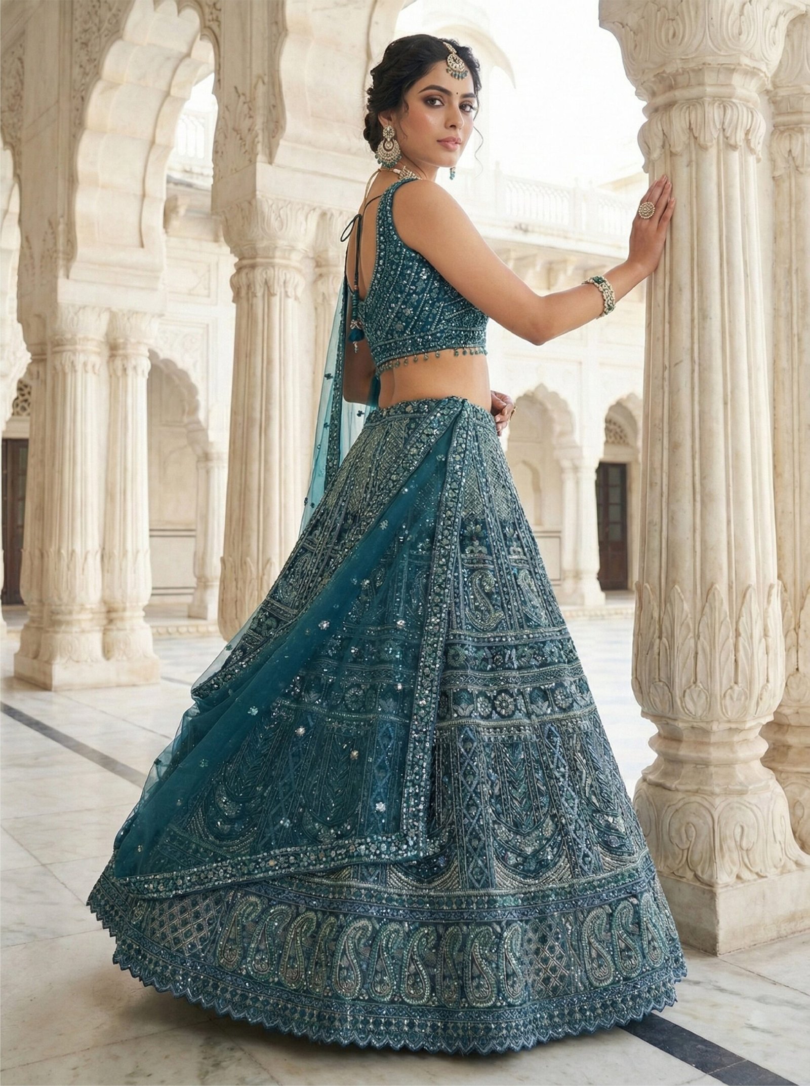 Elevate your ethnic wardrobe with this stunning Green Net Heavy Hand Embroidered Ghagra Set. Crafted from premium net fabric, this ensemble features intricate hand embroidery that showcases traditional artistry and contemporary elegance. The flowing ghagra silhouette flatters every body type, while the detailed embellishments add a touch of sophistication perfect for weddings, festivals, and special celebrations. Pair it with traditional jewelry to complete your look. A timeless investment piece that brings grace and cultural richness to your collection.