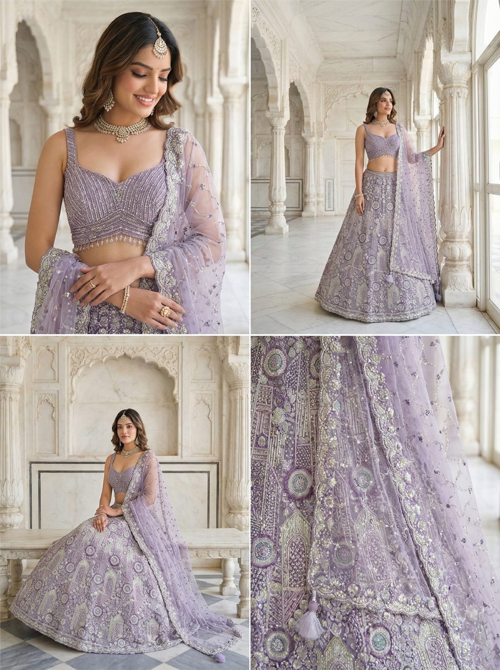 Elevate your festive wardrobe with this exquisite lilac ghagra set, meticulously crafted from premium net fabric. The ensemble features elaborate sequin and stone embroidery work that catches light beautifully, creating a mesmerizing shimmer with every movement. The intricate detailing showcases traditional craftsmanship combined with contemporary design sensibilities, making it an ideal choice for weddings, celebrations, and special occasions. The flowing silhouette of the ghagra ensures graceful draping and comfortable wear throughout your event. Perfect for those who appreciate refined ethnic fashion with substantial embellishment and timeless appeal.