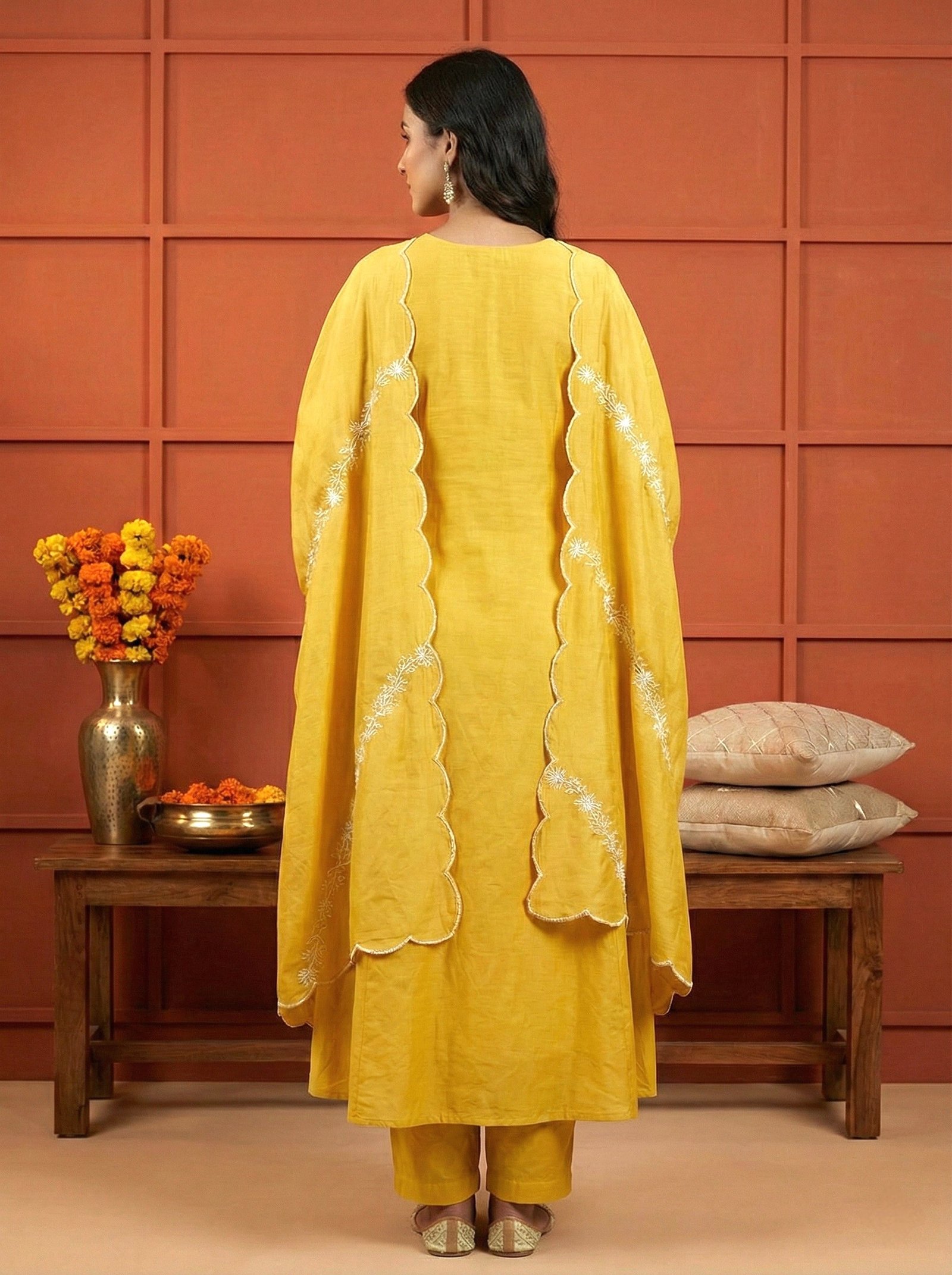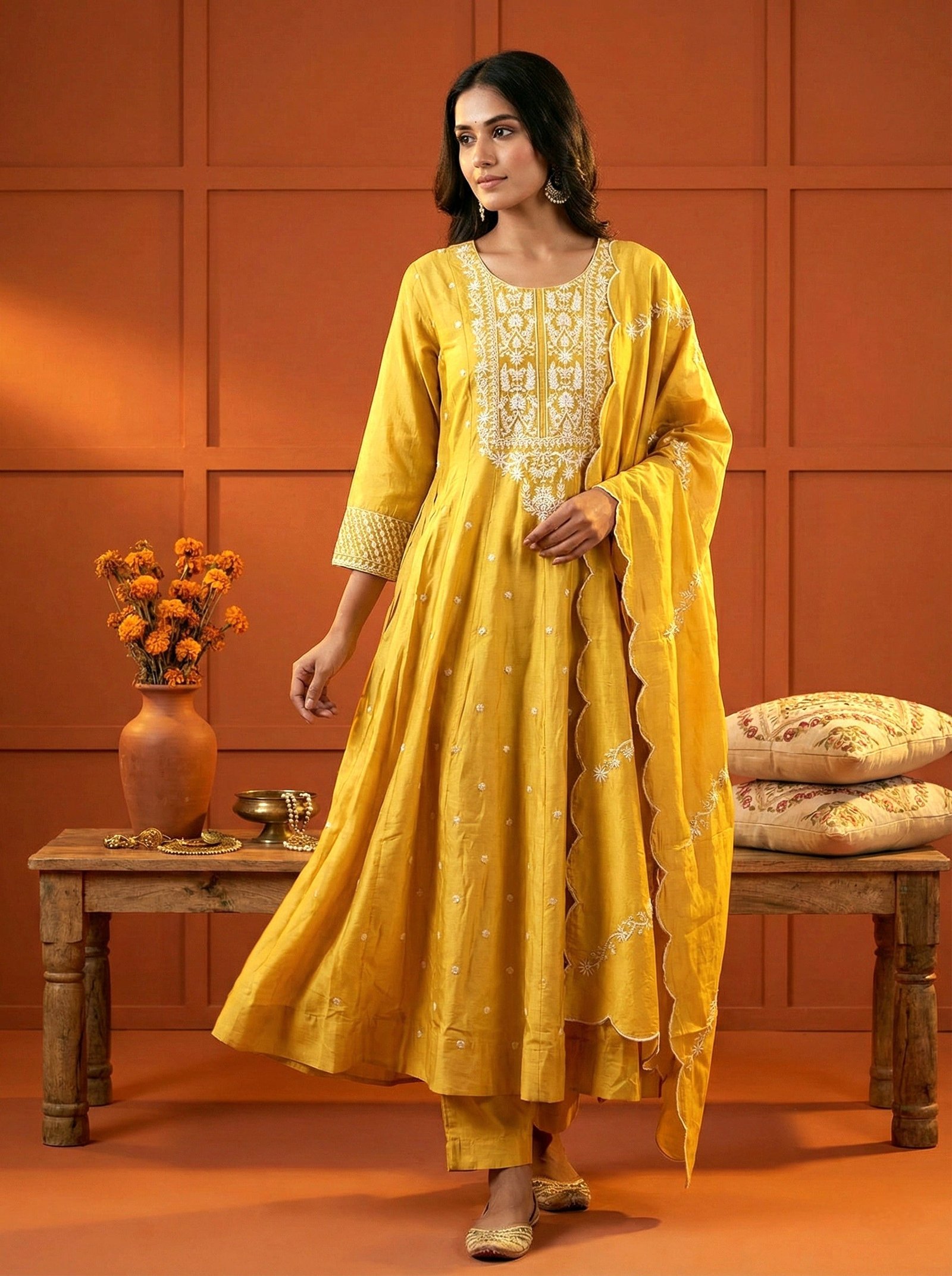 Elevate your ethnic wardrobe with this sophisticated three-piece ensemble featuring intricate silk thread embroidery in warm mustard tones. Each piece is meticulously crafted with traditional embroidery techniques, showcasing detailed threadwork that adds depth and texture. The coordinated set offers versatility for festive occasions, celebrations, and formal gatherings. Premium silk thread detailing ensures durability while maintaining an elegant finish. Perfect for those who appreciate refined craftsmanship and timeless design, this collection combines cultural heritage with contemporary styling.