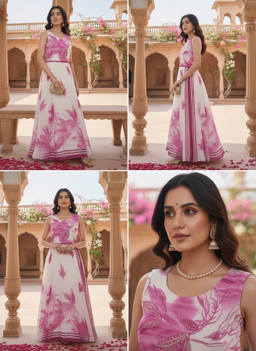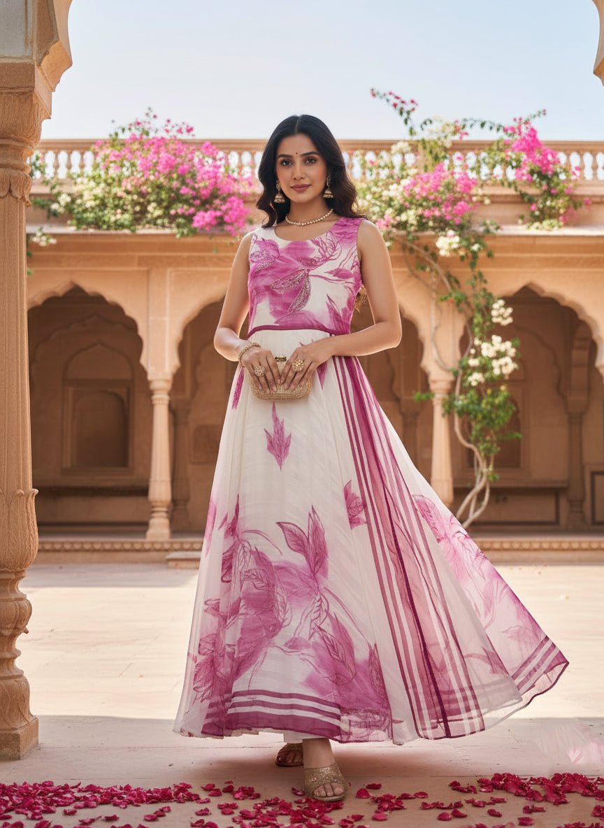 Elevate your ethnic wardrobe with this sophisticated off-white chiffon long dress, featuring an intricate floral print that captures timeless elegance. Crafted from lightweight, breathable chiffon fabric, this piece drapes beautifully and offers exceptional comfort for all-day wear. The flowing silhouette and floor-length design make it ideal for festive occasions, celebrations, or refined everyday styling. The delicate floral motif adds visual interest while maintaining a refined aesthetic. Perfect for those seeking versatile, graceful pieces that blend traditional charm with contemporary sensibility.