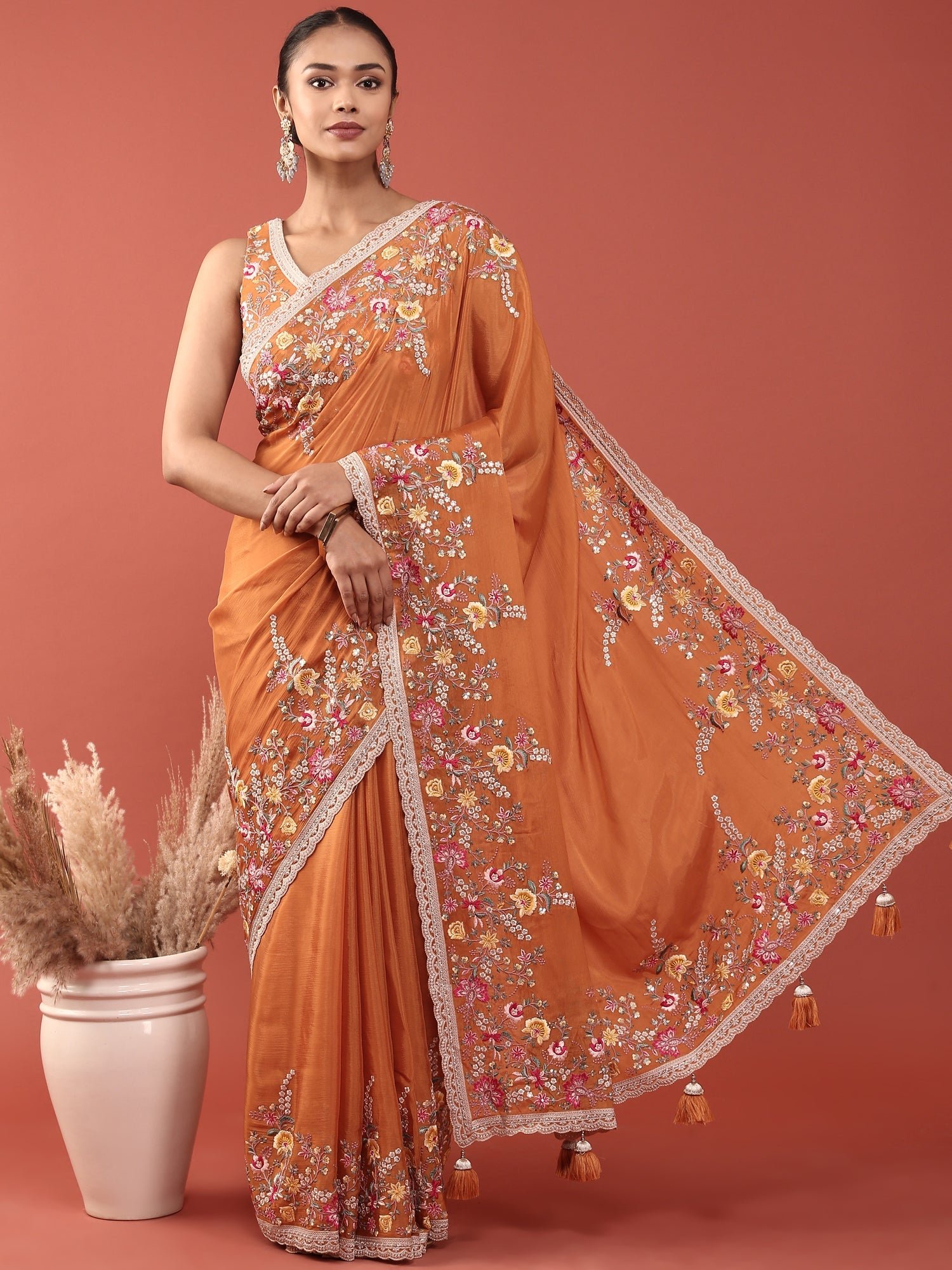 Orange Crepe Embroidery Saree With Readymade Blouse