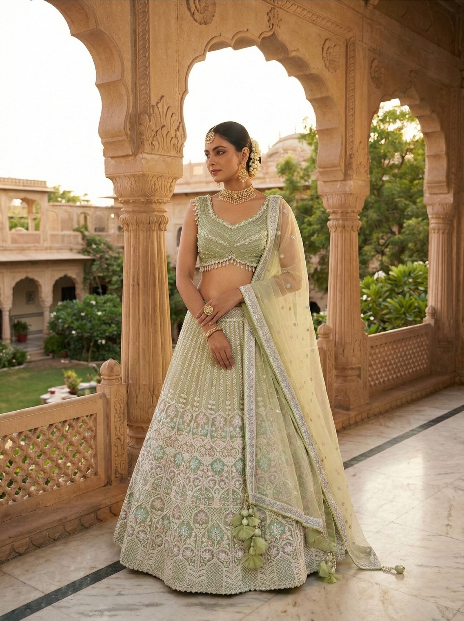 Elevate your festive wardrobe with this stunning Pista Net Sequins and Stone Embroidery Ghagra Set. Crafted from luxurious net fabric, this ensemble features intricate sequin and stone embroidery work that catches light beautifully, making you the center of attention at any celebration. The soft pista green hue exudes elegance and sophistication, while the detailed embellishments add a touch of traditional charm. Perfect for weddings, festivals, and special occasions, this ghagra set combines timeless Indian craftsmanship with contemporary style. Comfortable yet glamorous, it’s an investment piece that promises to become your go-to choice for memorable moments.