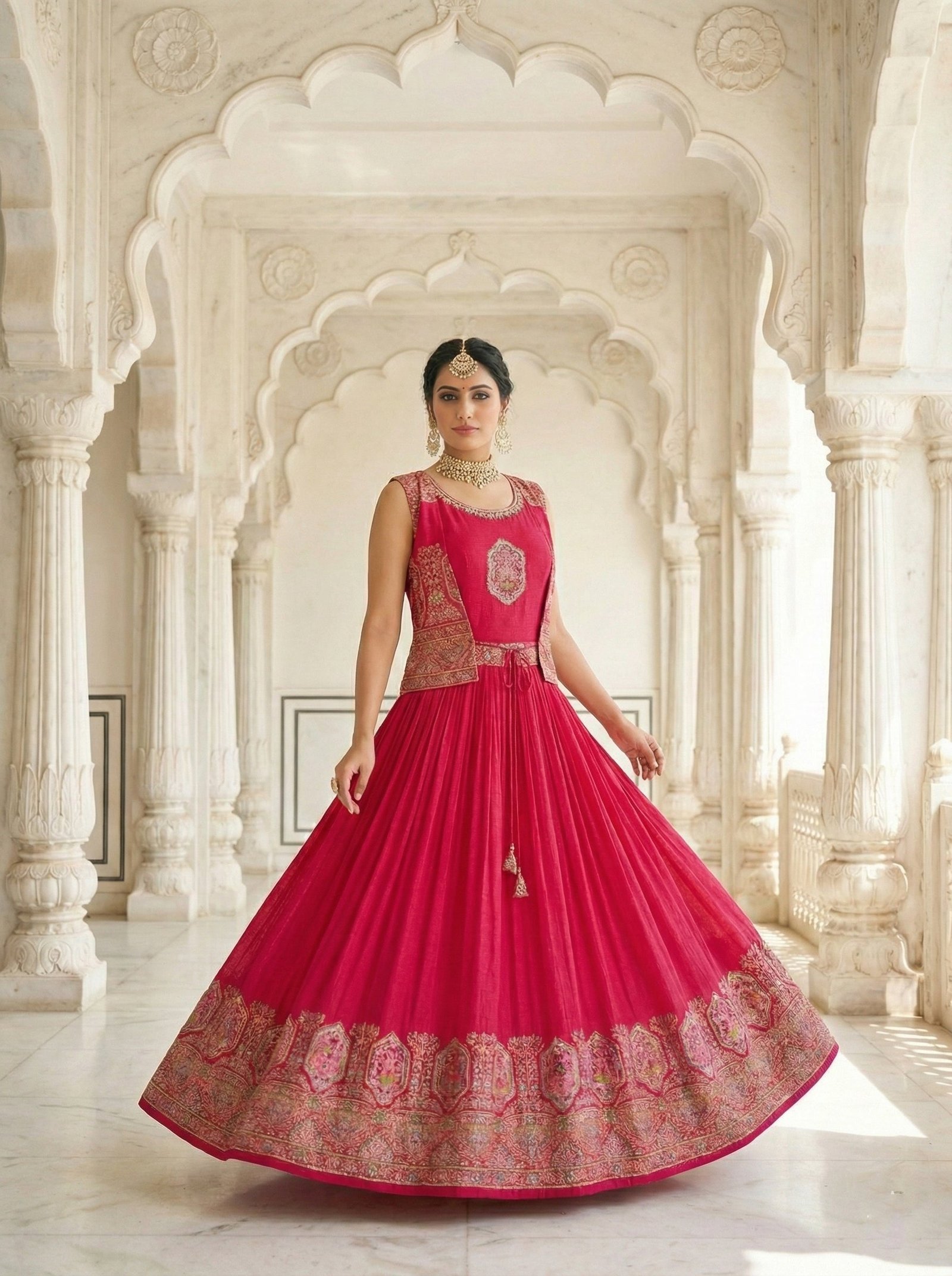 Elevate your ethnic wardrobe with this stunning Rani Georgette Digital Print Long Dress. Crafted from premium georgette fabric, this piece features intricate digital prints that showcase contemporary artistry with traditional sensibilities. The flowing silhouette drapes gracefully, offering both comfort and elegance for festive occasions, celebrations, or refined everyday wear. The rich rani hue complements diverse skin tones, while the lightweight fabric ensures breathability in warm climates.