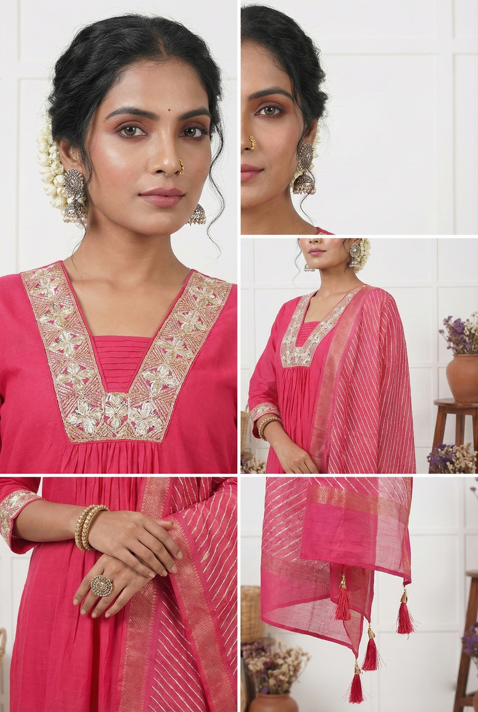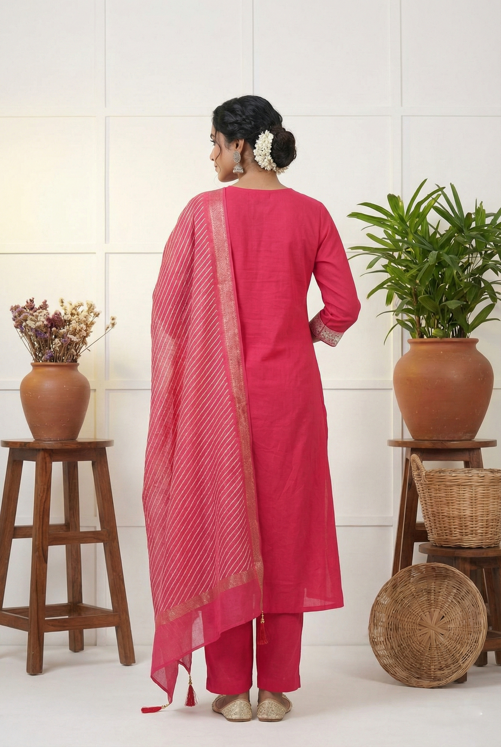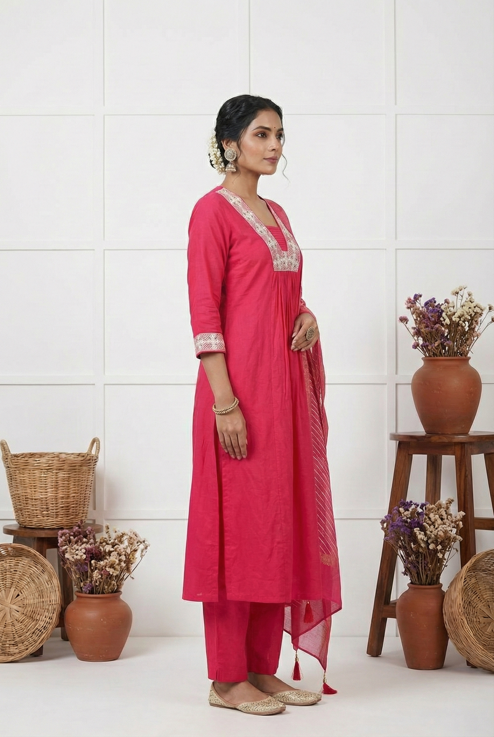 Elevate your ethnic wardrobe with this exquisite three-piece ensemble in regal rani pink. Adorned with intricate zari thread embroidery, each piece showcases meticulous craftsmanship and timeless elegance. The rich color palette and detailed threadwork create a striking visual appeal, perfect for festive occasions, celebrations, or making a refined statement at special events. This sophisticated set combines traditional artistry with contemporary styling, offering versatility and grace for the discerning wearer.