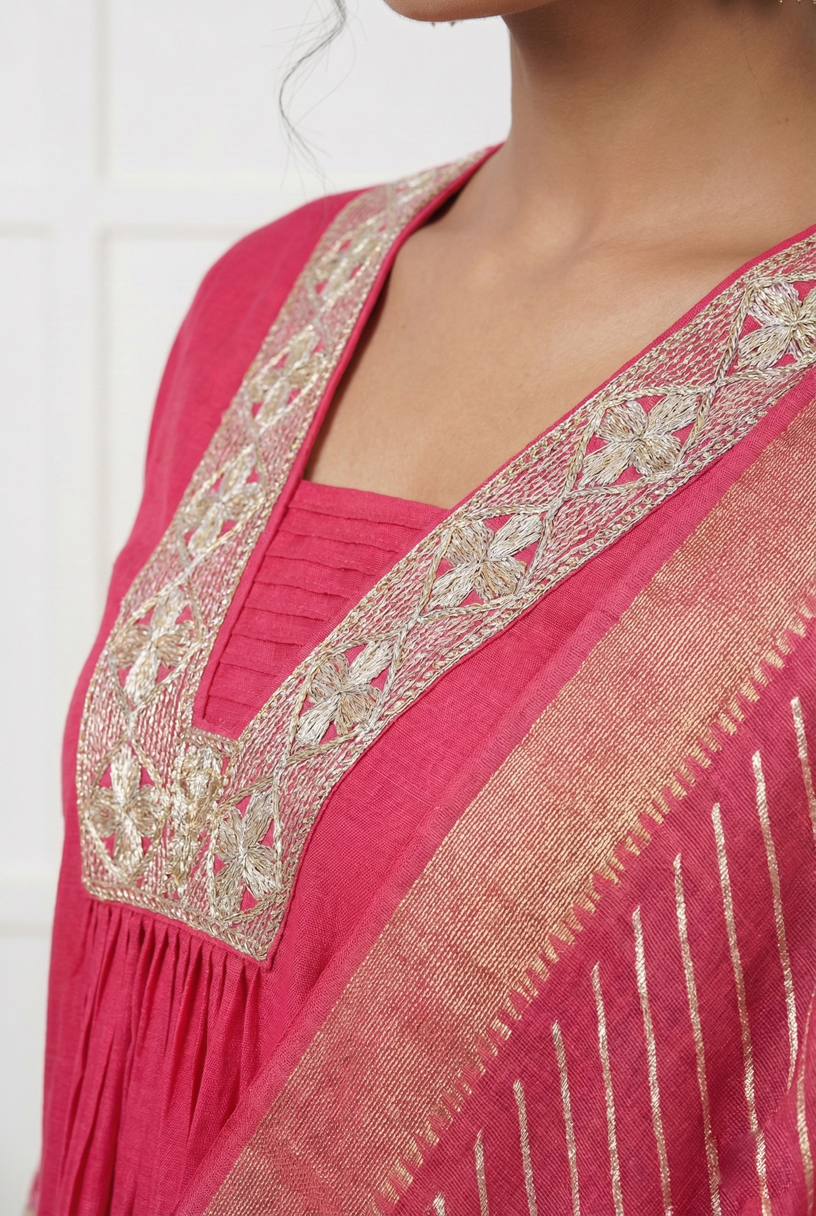 Rani Pink Muslin Zari Thread Embroidery Three Piece Set