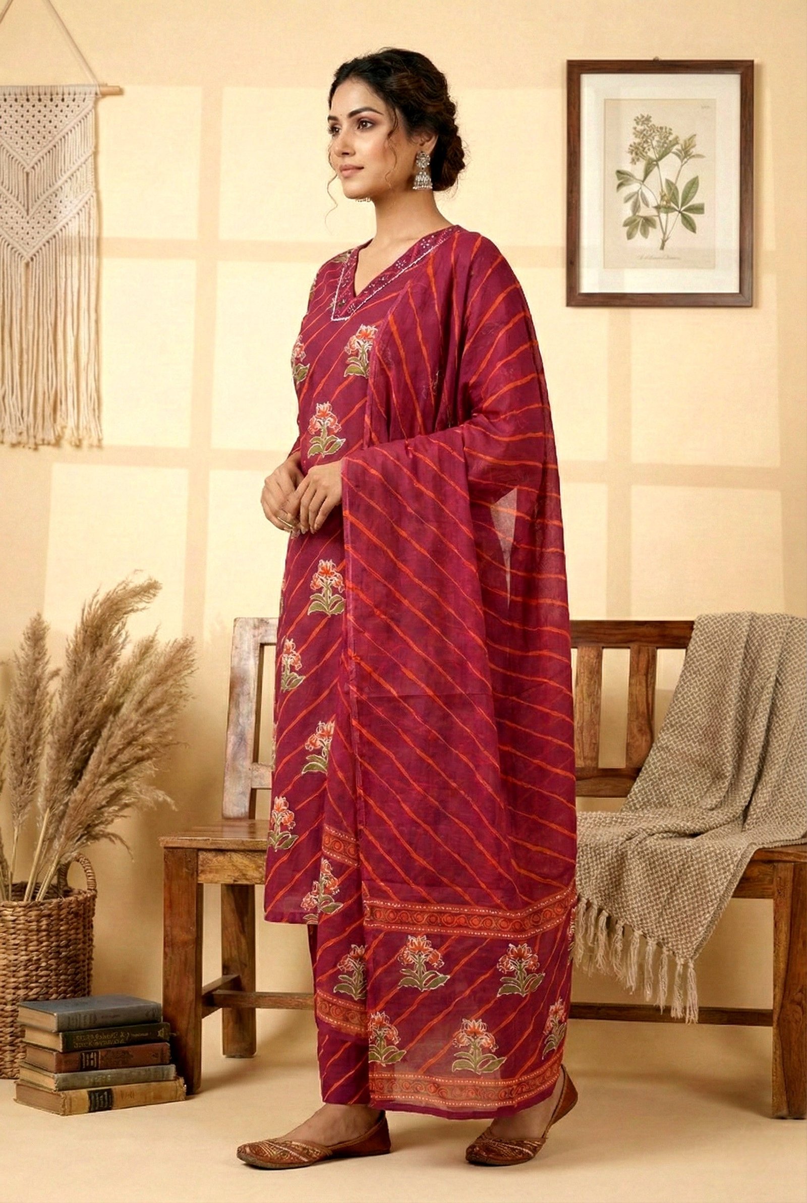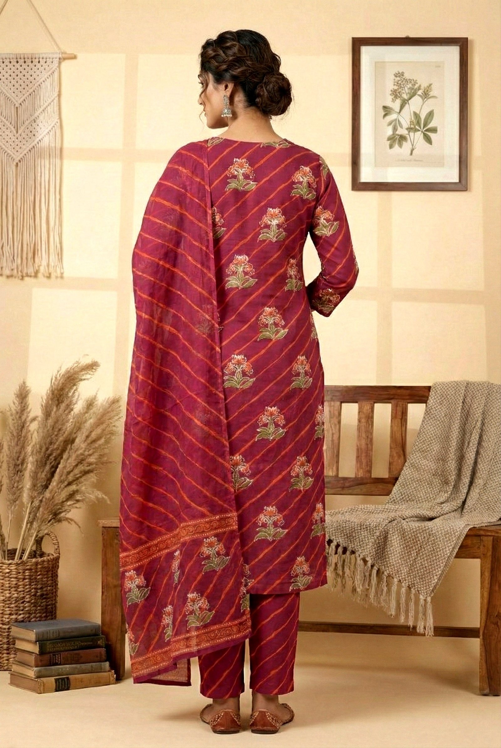 Elevate your wardrobe with this sophisticated three-piece ensemble crafted from premium cotton. The wine-hued fabric showcases an intricate floral digital print that combines traditional aesthetics with contemporary design sensibilities. This versatile set offers refined styling options, whether worn together for a coordinated look or mixed individually with existing pieces. The breathable cotton construction ensures comfort throughout the day, while the carefully curated color palette complements a range of skin tones. Perfect for both casual occasions and semi-formal gatherings, this collection represents thoughtful craftsmanship and timeless elegance.