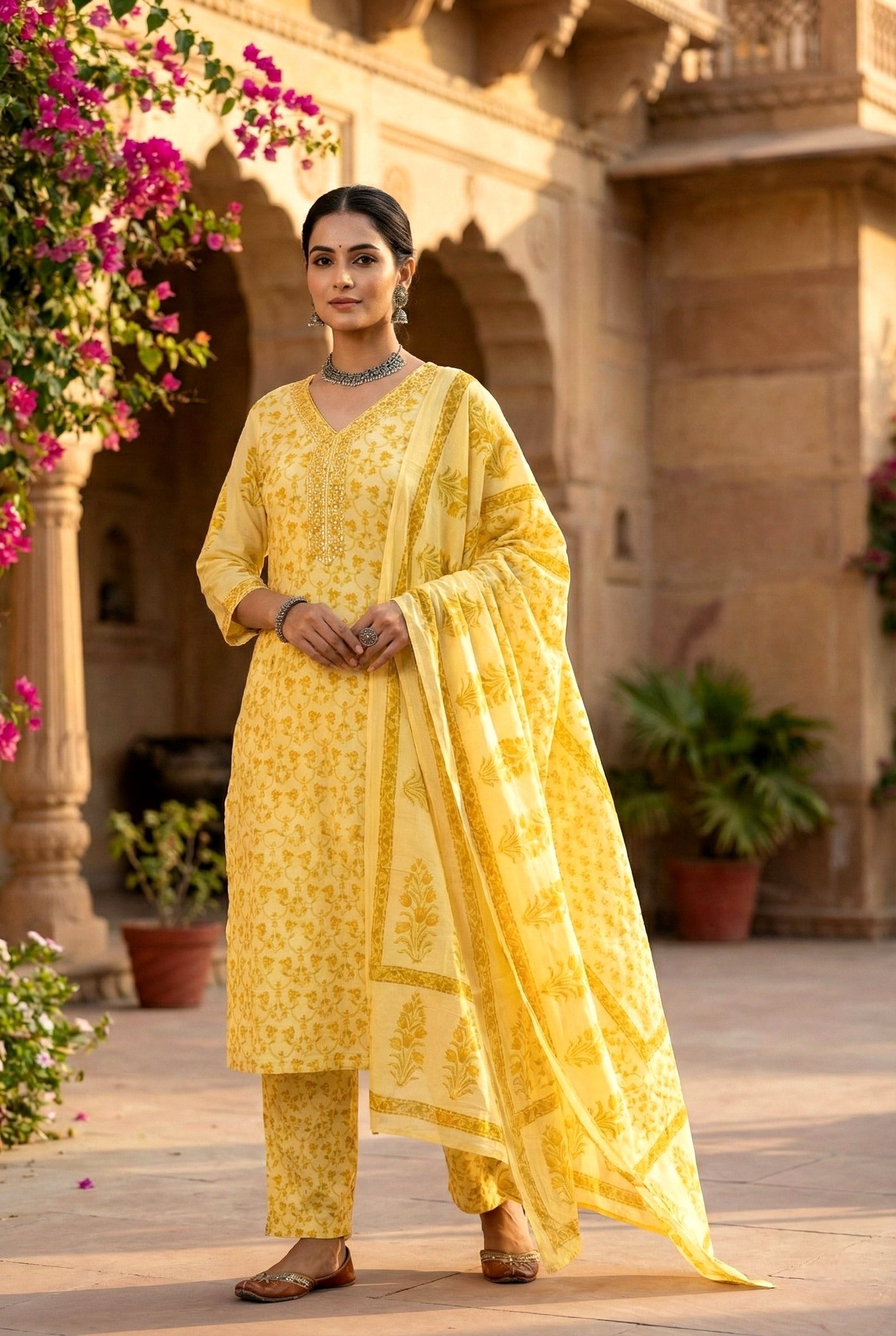 Radiate elegance in this stunning yellow cotton three-piece set, where traditional craftsmanship meets contemporary style. Each piece features intricate hand embroidery and shimmering sequin detailing that catches the light beautifully. The soft cotton fabric ensures comfort throughout the day, while the thoughtful design makes it perfect for celebrations, festivals, or special occasions. This versatile ensemble celebrates artisanal work and offers you a timeless addition to your wardrobe that you’ll treasure for years to come.